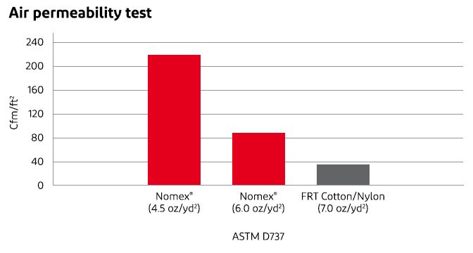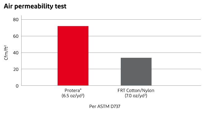 통기성은 원단의 공기 통과 능력입니다. 대부분의 FRT 제품은 내염 소재로 처리하거나 덮기 때문에, 무겁고 통기성이 떨어집니다. 반면 Nomex® 및 Protera®로 만든 의복은 FRT 원단의 2배에 달하는 통기성을 제공합니다.