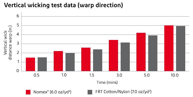 고려해야 할 마지막 요소는 수분 관리입니다. 신체가 건열 전달에서 증발 전열로 넘어가면, 몸에서 나오는 수분을 흡수하고 증발하게 하는 의복의 능력에 따라 착용자가 느끼는 편안함이 결정됩니다. Nomex® 및 Protera®로 만든 의복은 수분을 효과적으로 흡수합니다.