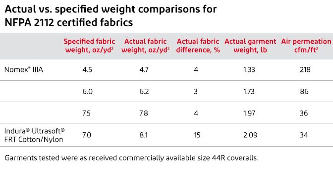 의복 착용자의 열 스트레스 발생에서는 섬유 종류보다 무게가 더 중요합니다. FR 의상 제조업체는 대부분 섬유 무게를 1제곱야드당 온스(oz/yd2)로 표시합니다.