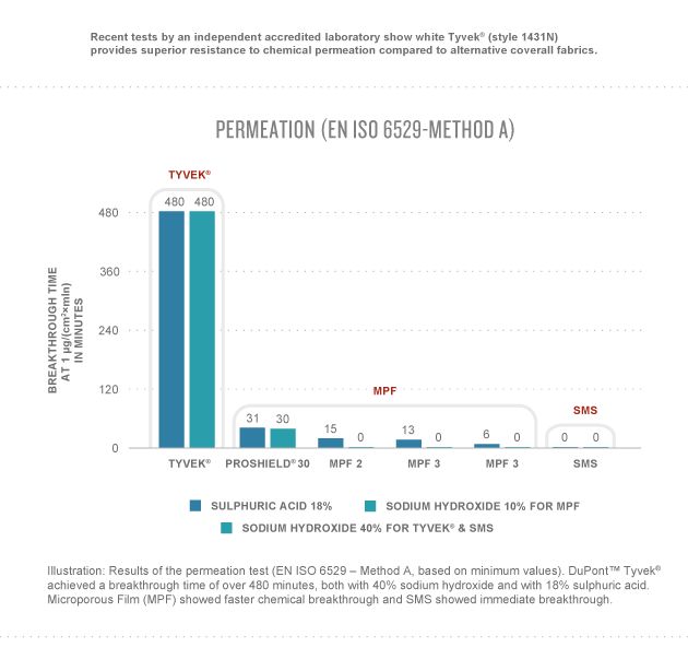 액체 침투는 액체가 원단의 구멍을 통과하여 침투되는 물리적 과정을 말합니다. 유해물질에 1분간 노출 시 - 실제 작업 환경에서는 거의 드문 경우 - EN ISO 5630 침투 시험 결과에서는 사실상 3가지 소재(SMS, Tyvek®, 미세 다공성 필름) 간 차이가 나타나지 않았습니다. 반면 투과는 유해한 액체 화학물질이 분사 수준에서 보호복 소재를 통과하여 이동하는 과정을 말합니다. EN ISO 6529 투과 시험은 8시간까지의 장기적 반응을 평가하기 때문에 훨씬 더 유의미한 실질적인 타당성을 갖고 있습니다.