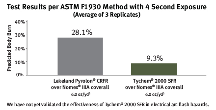 Tychem® 2000 SFR 보호복은 화재 발생 시 기능할 수 있도록 설계됐습니다. Tychem® 2000 SFR 보호복 개발 과정에서 보호복 디자인 및 부품 선택을 돕기 위해 이루어진 폭 넓은 ASTM F1930 (인체 공학적 열 인체 모형) 시험에서 최종 Tychem® 2000 SFR 보호복은 화재에 노출 될 때 지속적으로 우수한 성능을 발휘했습니다. Tychem® 2000 SFR 보호복은 Lakeland Pyrolon® CRFR을 포함하여 경쟁 보호복보다 훨씬 낮은 예상 신체 화상 강도를 보이며 화염의 지속이 적습니다. 화재에 노출 될 때 실제 보호복의 성능은 Secondary FR 보호복의 선택을 결정 짓는 중요한 요소가 되어야합니다. ASTM F1930 시험에서 Nomex® IIIA 전신보호복 6oz / yd2 위에 본 보호복을 착용하고 4 초간의 화염에 노출됐을 때 Lakeland Pyrolon®은 28.1 %의 신체 화상 결과를 나타내는 반면 Tychem® 2000 SFR은 9.3 %의 신체 화상 결과를 보여줍니다.